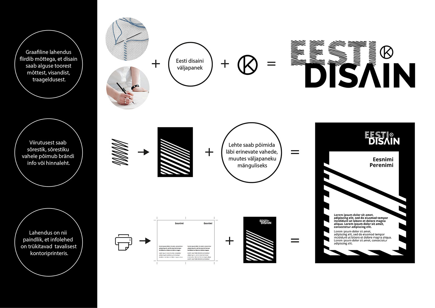 Disaini väljapaneku graafiline lahendus flirdib mõttega, et disain saab alguse visandist. Sellest inspireeritud graafilisest visuaalist kasvab välja kolmemõõtmeline objekt – hinna ja info alus. Viirutusest saab sõrestik, sõrestiku vahele põimub brändi info või hinnaleht. Lahendus on nii paindlik, et infolehed on trükitavad kontori printerist ja sõrestik annab mänguruumi põimida lehte läbi erinevate vahede ning moodustada erinevaid mustreid.