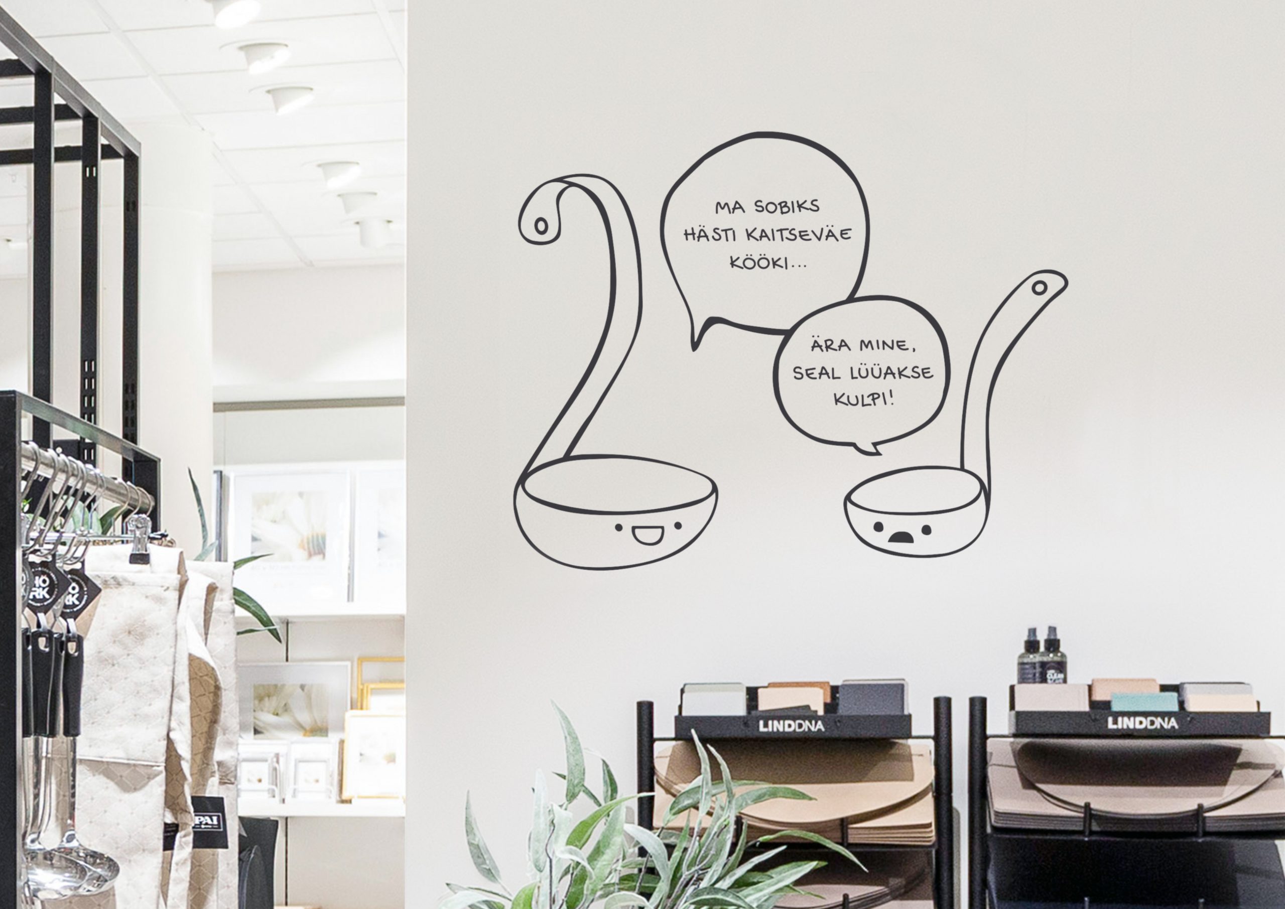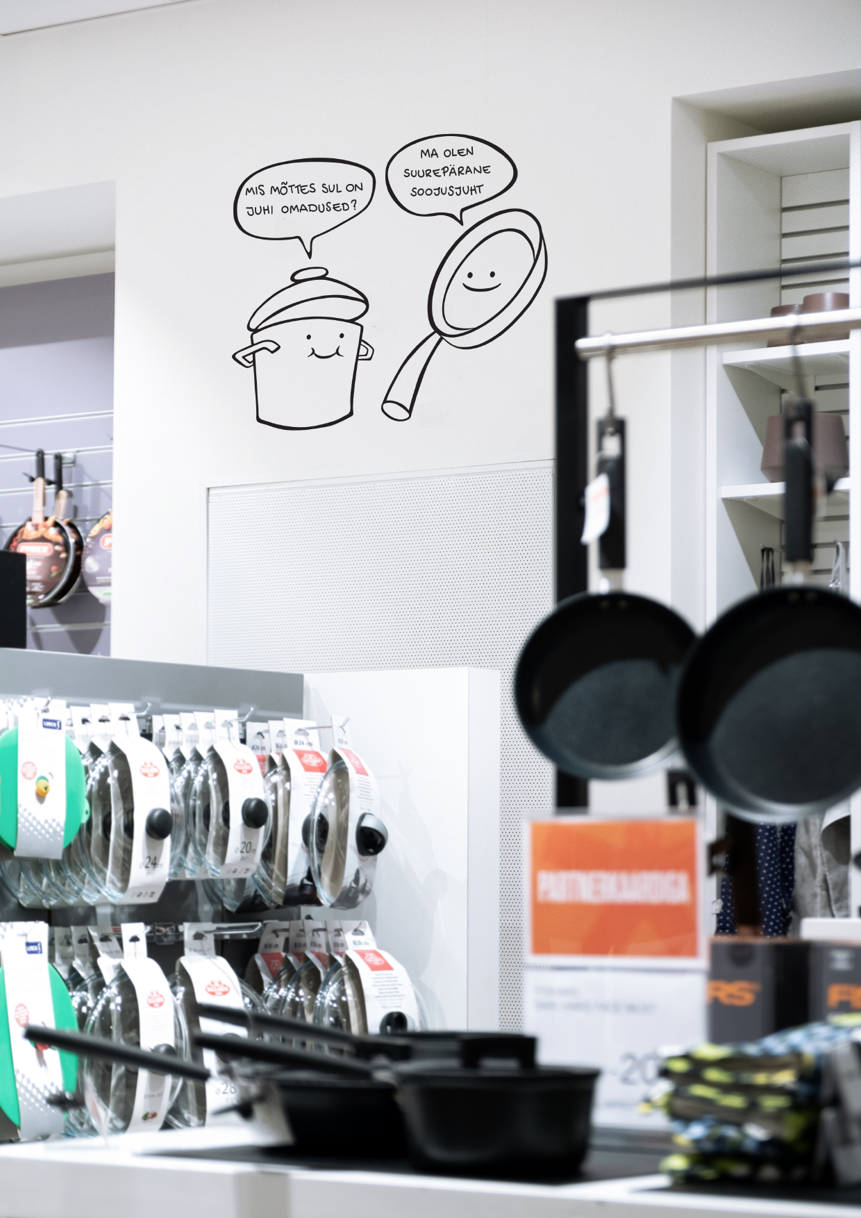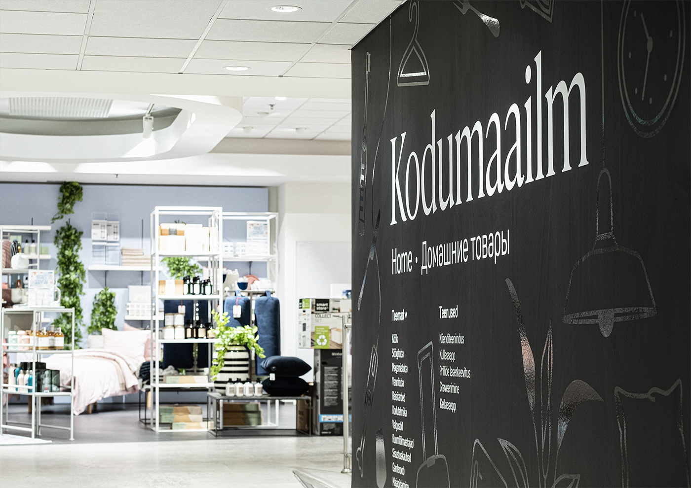 Kodumaailma kujundusprojekt hõlmas üle 20 fookusmaja ehk poeosakonna nime väljatöötamist koos visuaalse keelega. Uue ilme said esindusseinad, kus illustratsioonid hakkasid seintel elama tänu mati ja läikiva pinna vaheldumisele. Projekti mahtus ka kassatähtede kujundus ja ligi 20 toodete omavahelist humoorikat dialoogi, mis aitavad lõbusal moel toote omadusi külastajale tutvustada ja seeläbi sobivaim ostuotsus teha. Lisaks seinadele, ilmuvad illustratsioonid animeeritult ka ekraanidel.